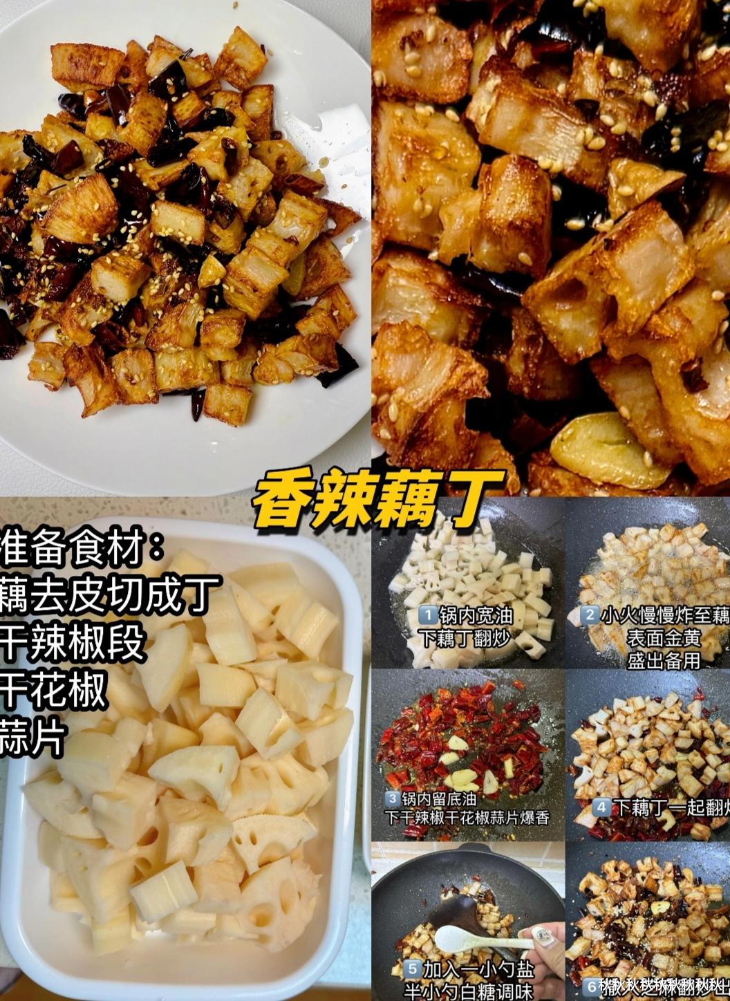 将之前炸好的藕丁重新倒入锅中,与干辣椒、干花椒和蒜片一起翻炒均匀。